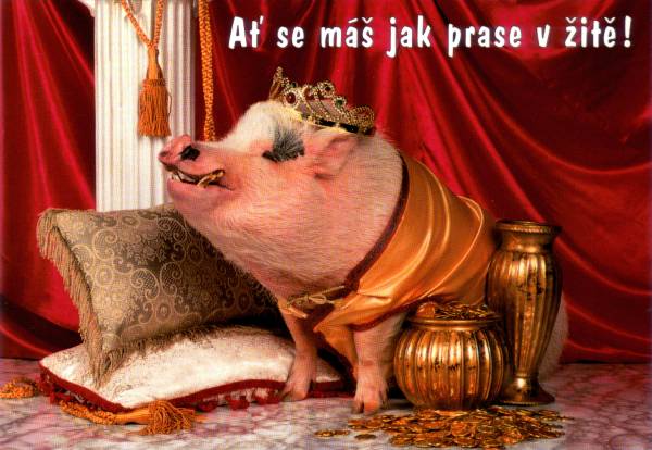 A tak si milé prasátko... šňuplo... páč mělo dojem... že pravda je vždy zářivější... světlejší a hezčí... že pravda je ráj... a sen je peklo. Když tu náhle se sním všechno zatočilo... a ono se objevilo v obrovské hale v kotci s číslem 2012. "Kde to jsem a co je to za smrad!" "Jsi v prasečáku... tisíce prasat vměstnaných do jednoho chlívu... neschopných pohybu... nesvobodných... určených pouze žrát a srát... to tu smrdí Neo... Den za dnem... měsíc za měsícem... rok za rokem... to tu smrdí... Neo..." "Pane Bože a kde mám koule!?" "Duše je bezpohlavní Neo... žádný sex... žádní kanci žádné svině... sex byl prvotní způsob jak vás udržet v Meatrixu, pak se vynalezly peníze a duchovní vědy... jež měly dát životu v Meatrixu hlubší smysl... A ty jsi chtěl znát pravdu, ty jsi chtěl znát smysl svého života... ty jsi se chtěl osvobodit... takže vítej na svobodě..." "Tohle má být rajská svoboda? Život bez sexu... s břečkou šrotu v korytě... v hale plné smradu? A za to já se modlil a platil desátky? Kvůli tomu jsem trpěl a snášel vykořisťování?" "Vítej v poušti naší reality Neo. Vše co jsi znal byl jen program, který měl dát tvému životu smysl... a to je hlavní účel Meatrixu... mít krásný smysl života... aby se nikdo nesetkal s krutou realitou... " "A co láska?" "Myslíš lásku co dává housenkám křídla... aby nemusely žrát tu kyselou zelenou břečku a stali se znich duchovní motýli, jež budou pít jen nektar božských květů?" "Ano takovou lásku myslím..." "Tak to je láska... co dává housenkám křídla, aby ptáci, jež se motýlem živí neriskovali při přistání na zemi setkání s dravou kočkou. Láska která říká... milujte se a množte se... což bez perte se a žerte se není možné... Život = Smrt, Láska = Nenávist... vždy dokonale vyvážená rovnice... Už nevíme kdo začal první... opájeli jsme se vlastní dokonalostí... protože jsme stvořili UI..." "Myslíš umělou inteligenci?" "Ano... ale tím se také zrodila nová generace masožravců... A tito proměnili náš svět plný louží a bukvic... ve svět železných a zděných a kouřících krabiček... zvaný Meatrix... Existují velká jatka... velké kuchyně... a velké jídelny Neo... Od narození ti byla pravda zatajena... oni si nás pěstují... aby z nás nakonec udělali tohle... (Párek Happy Pigs)." "Ne... to snad nemůže být pravda... to není možné... já chci ven! Pusťte mě ven...!" "Neboj Neo... brzy i ty se dostaneš do velkého mlýnku... měj se moc hezky... a nezapomeň na toho kdo ti dodal bílý prášek... víš kde mě najdeš Neo... ukážu ti cestu do ráje... mám i růžový prášek... i zelený prášek... i Chrochtalen... i Prasvital... Kvikazon... Multiser... pro tebe ze zcela ojedinělým bonusem nulové Achrochtace... a nejnižší sazbou povinného kvičení... Tvůj úvěr... tvůj život... proč se omezovat... splň si své sny už dnes... žij dnes a plať až zítra... Divine Life Bank